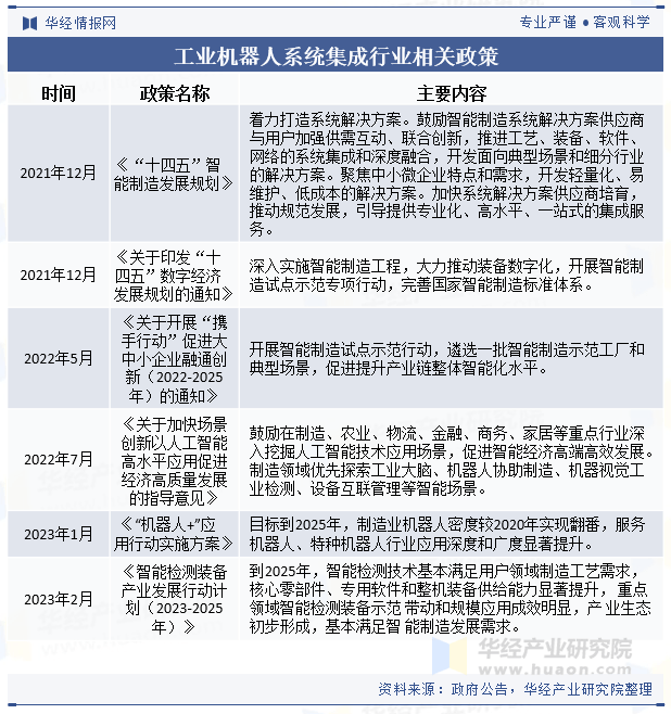 2021年12月,工信部、发改委和科技部等八部分结合印发了《“十四五”智能制制成长规划》,明白提出了“出力打制系统处理方案。激励智能制制系统处理方案供应商取用户加强供需互动、结合立异,推进工艺、配备、软件、收集的系统集成和深度融合,开辟面向典型场景和细分行业的处理方案。此外,《关于加速场景立异以人工智能高程度使用推进经济高质量成长的指点看法》、《“十四五”智能制制成长规划》等多个政策文件也明白提出要鞭策智能制制和系统集成的鼎力成长。国度各级部分下发的计谋性文件为工业机械人系统集成行业的成长供给了优良的政策,跟着这些政策的逐步落实,